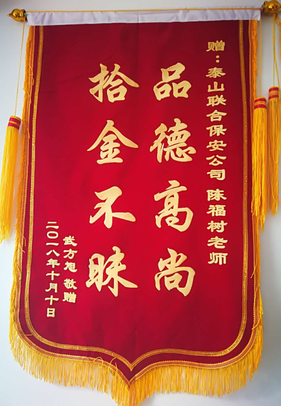 2018年10月10日下午14:40左右,在中行ATM機(jī)取款時(shí),由于家人緊急來電,在接電話后轉(zhuǎn)身離開,將現(xiàn)金20000元遺落在ATM機(jī)上。駕車行駛約兩公里后,才發(fā)現(xiàn)未將現(xiàn)金帶回,趕回銀行發(fā)現(xiàn),銀行大廳值班保安陳福樹同志已將現(xiàn)金上交行長保管,等待丟款人回來認(rèn)領(lǐng)。為此,該客戶特意送來感謝信及錦旗一面,表示感謝。陳福樹同志拾金不昧的精神體現(xiàn)出了泰山聯(lián)合保安全心全意為客戶單位做好服務(wù)的優(yōu)良作風(fēng)。經(jīng)公司研究決定,給予保安隊(duì)員陳福樹同志通報(bào)表揚(yáng),獎勵現(xiàn)金400元,以資鼓勵。