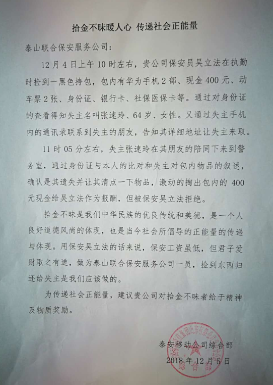 原來(lái)12月4日上午10時(shí)許,張速玲女士到移動(dòng)公司大廳辦理業(yè)務(wù)時(shí),將一黑色挎包不慎丟失在營(yíng)業(yè)廳內(nèi)。保安隊(duì)員吳立法同志在大廳內(nèi)巡邏時(shí)撿到,后經(jīng)多方查找才找到丟失物品的主人,失主張女士因忙于辦理業(yè)務(wù)而將錢包證件不慎丟失,經(jīng)查內(nèi)有手機(jī)2部、400余元現(xiàn)金、多張銀行卡、動(dòng)車票2張等物品一宗,工作人員確認(rèn)后將物品完璧歸趙。吳立法同志拾金不昧的精神體現(xiàn)出了泰山聯(lián)合保安全心全意為客戶單位做好服務(wù)的優(yōu)良作風(fēng)。