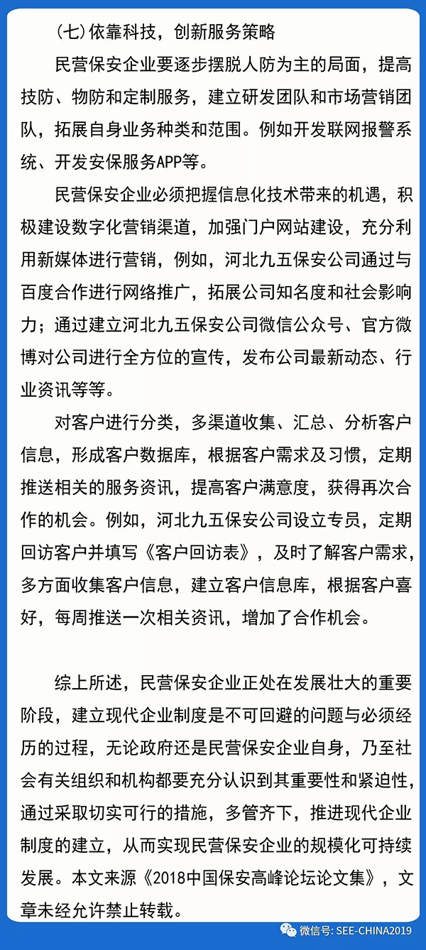 隨著社會(huì)經(jīng)濟(jì)的飛速發(fā)展,治安狀況日趨復(fù)雜,單純依靠國(guó)家機(jī)關(guān)維護(hù)社會(huì)治安已很不現(xiàn)實(shí),需要大量的社會(huì)力量參與到維護(hù)社會(huì)治安中,我國(guó)保安行業(yè)的發(fā)展已經(jīng)迎來(lái)了新的時(shí)代,既充滿希望又任重道遠(yuǎn),保安人員在社會(huì)中發(fā)揮的維護(hù)社會(huì)治安穩(wěn)定的作用越來(lái)越重要。自2010年《保安服務(wù)管理?xiàng)l例》施行以來(lái),保安服務(wù)市場(chǎng)逐步開放,民營(yíng)保安企業(yè)進(jìn)入歷史舞臺(tái),成果豐碩。經(jīng)過(guò)8年的發(fā)展,民營(yíng)保安企業(yè)已經(jīng)占據(jù)了保安市場(chǎng)的半壁江山,已成為協(xié)助公安機(jī)關(guān)維護(hù)社會(huì)治安穩(wěn)定構(gòu)建平安中國(guó)不可或缺的重要力量。站在新時(shí)代新的歷史起點(diǎn),民營(yíng)保安企業(yè)進(jìn)入二次創(chuàng)業(yè)階段,面臨著批判地繼承傳統(tǒng)與創(chuàng)新發(fā)展的問(wèn)題,迫切需要建立現(xiàn)代企業(yè)制度,轉(zhuǎn)變企業(yè)經(jīng)營(yíng)模式,實(shí)現(xiàn)企業(yè)利潤(rùn)最大化,從而避免“民營(yíng)企業(yè)迅速地崛起、迅速地衰落”的悲劇。