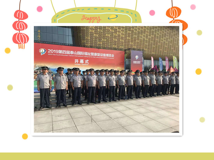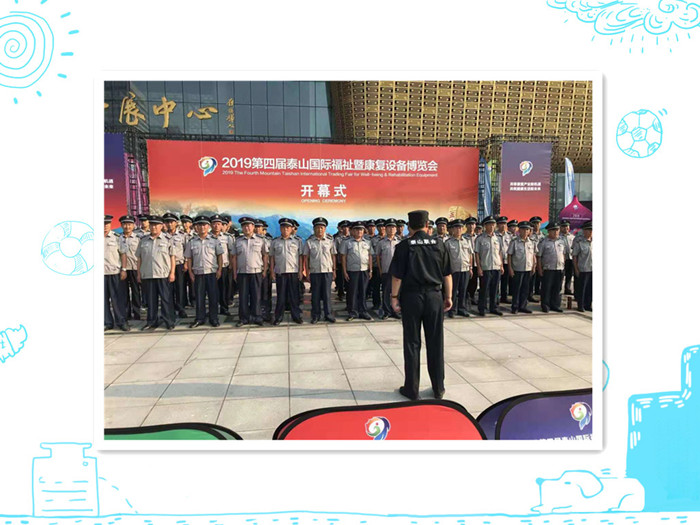 2019年9月6日至8日,“第四屆泰山國際福祉暨康復設備博覽會”在會展中心舉辦,抽調保安力量180余人次。樹立強烈責任感,以優(yōu)質的服務理念圓滿完成此次安保勤務工作,并獲得社會各界高度認可。